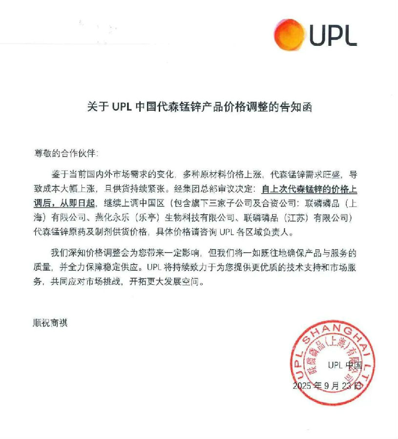 据调价函,9月23日起,UPL将对中国区(包括旗下三家子公司及合资公司:联磷磷品(上海)有限公司、燕化永乐(乐亭)生物科技有限公司、联磷磷品(江苏)有限公司)的代森锰锌原药及制剂供货价格进行新一轮上调。