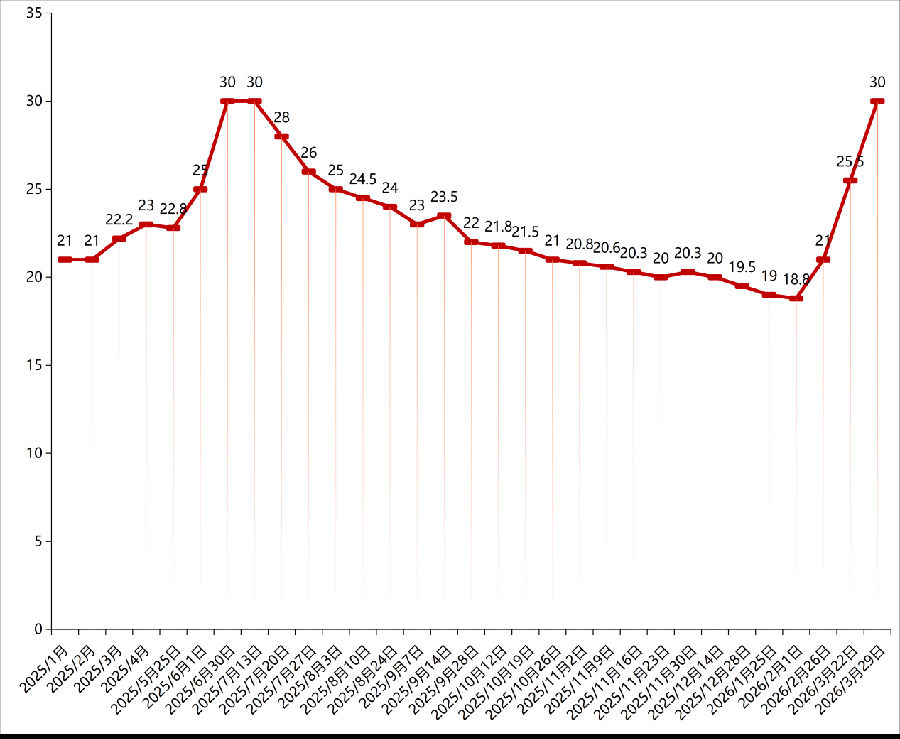 截至2026年3月29日,国内氯虫苯甲酰胺原药价格走势(单位:万元/吨)