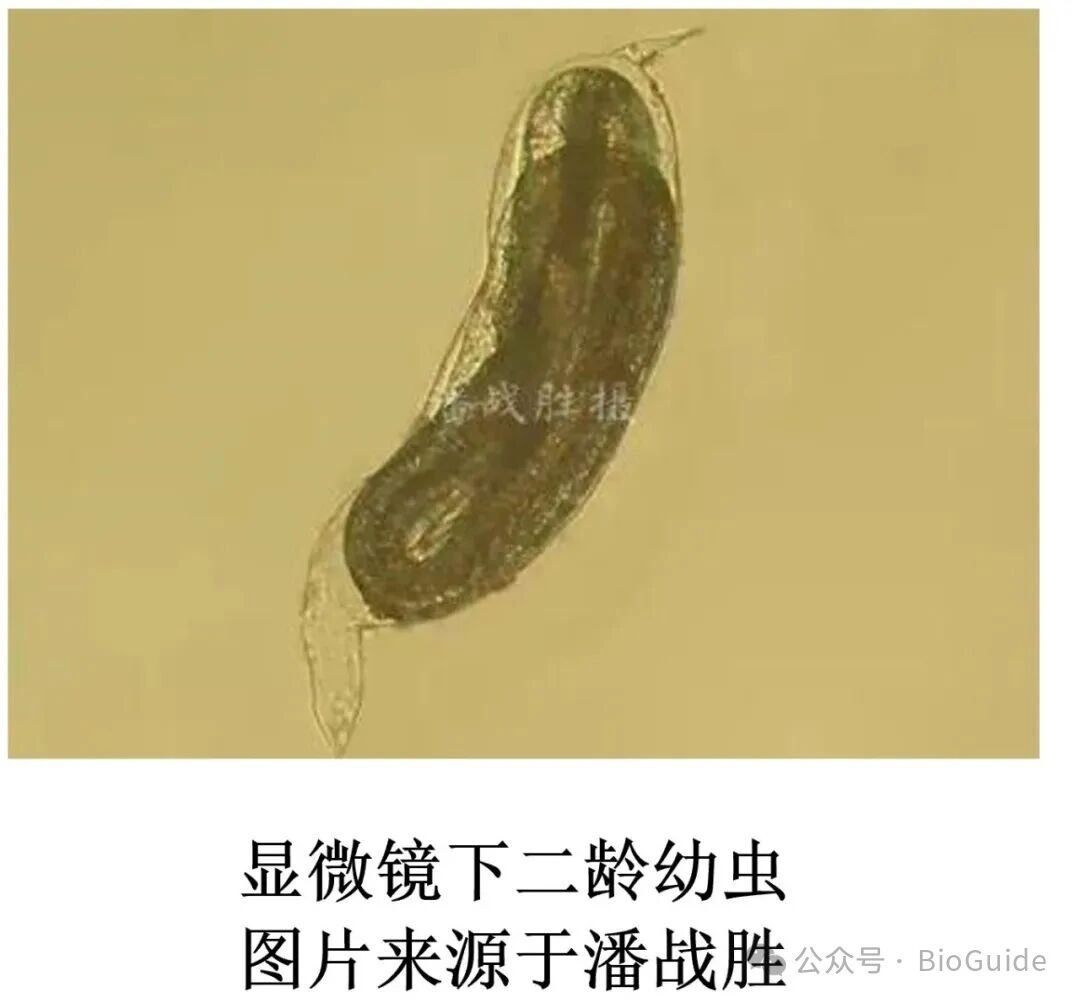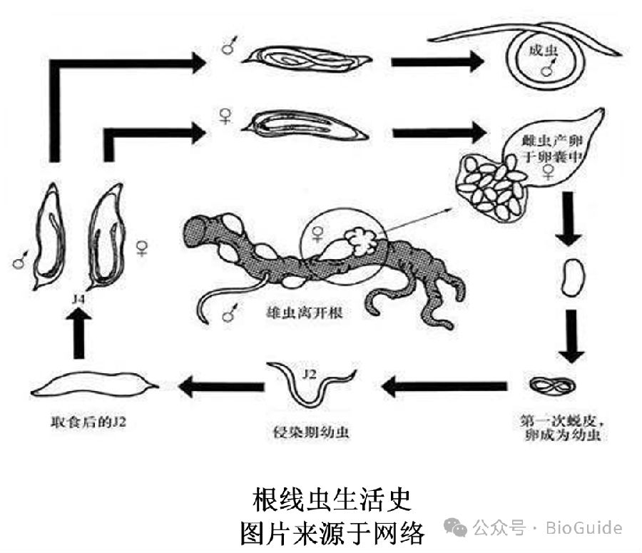 幼虫期分为四个龄期,其中二龄幼虫(J2)是根结线虫侵染寄主植物的唯一虫态,其他龄期幼虫均在寄主根系内发育。