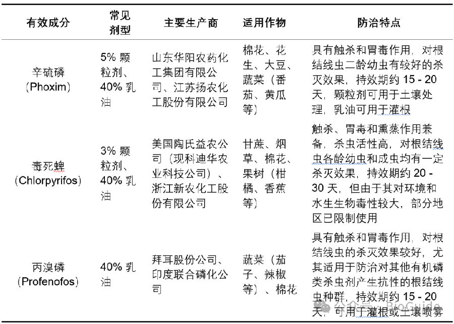 有机磷类杀虫剂通过抑制根结线虫体内的胆碱酯酶活性,破坏其神经系统功能,从而达到杀灭根结线虫的目的,该类杀虫剂具有作用迅速、杀虫谱广的特点,但部分品种毒性较高,使用时需注意安全。