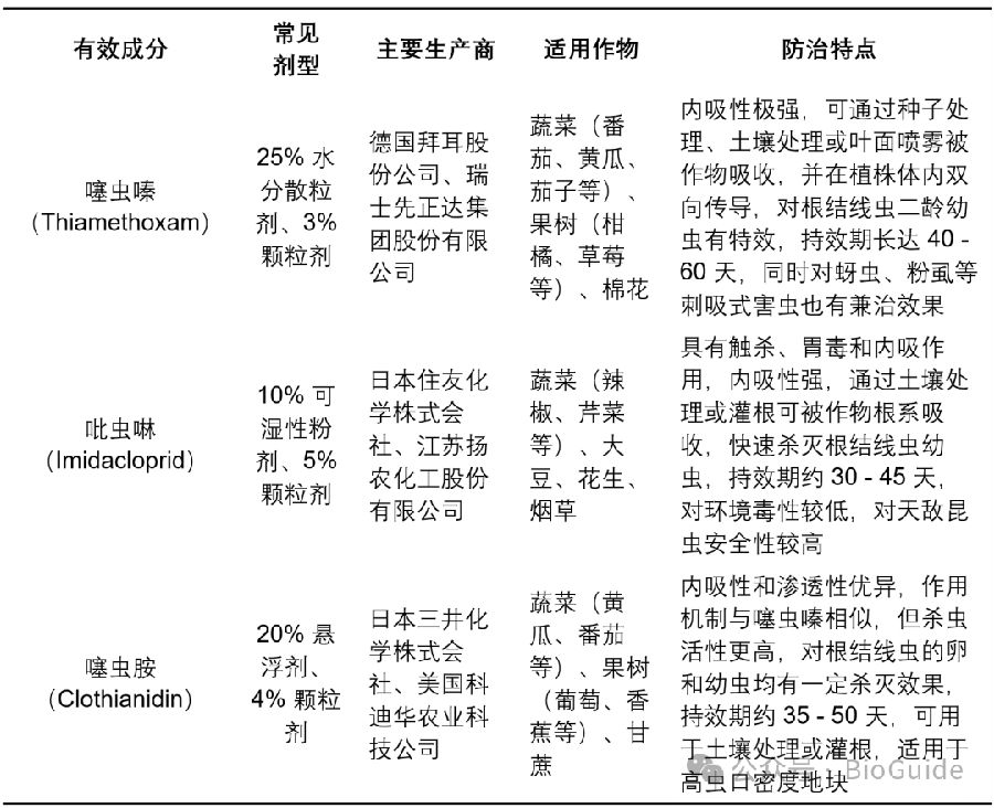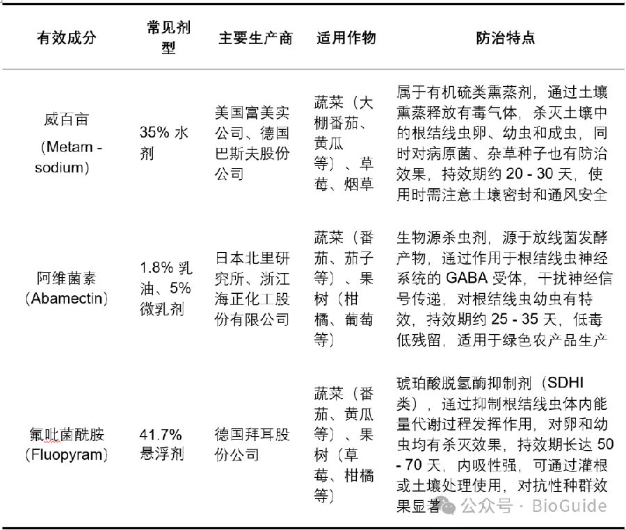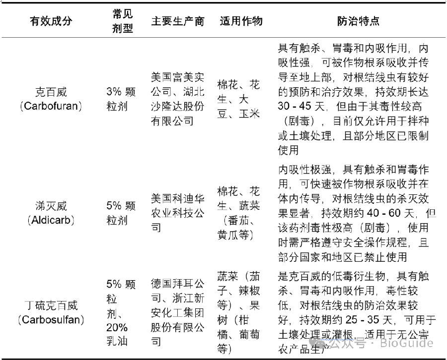除上述三类主流杀虫剂外,还有部分特殊作用机制的杀虫剂在根结线虫防治中应用,主要包括有机硫类、生物源杀虫剂等,这类药剂多具有针对性强、环境兼容性好的特点,适用于抗性治理和综合防治体系。