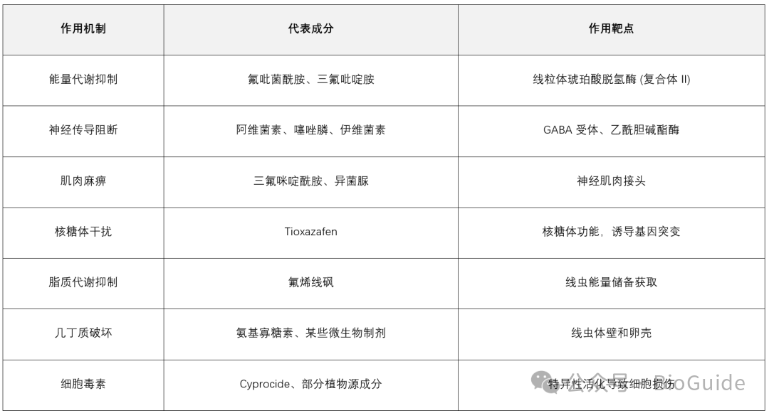(补充:Tioxazafen(商品名 NemaStrike?)、氟烯线砜(fluensulfone,商品名尼咪特 ®)、Cyprocide(1,3,4 - 噁二唑硫醚类)、柏威霉素(Baiweimectin,阿维菌素 B2a 组分)、多拉菌素(doramectin)和伊维菌素(ivermectin)这些也都是克用于杀线虫较新的组分。)
